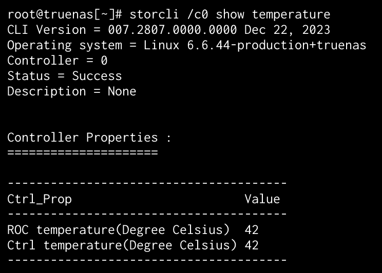 用 storcli 查看, H730 工作在 HBA 模式下的温度只有 42 度